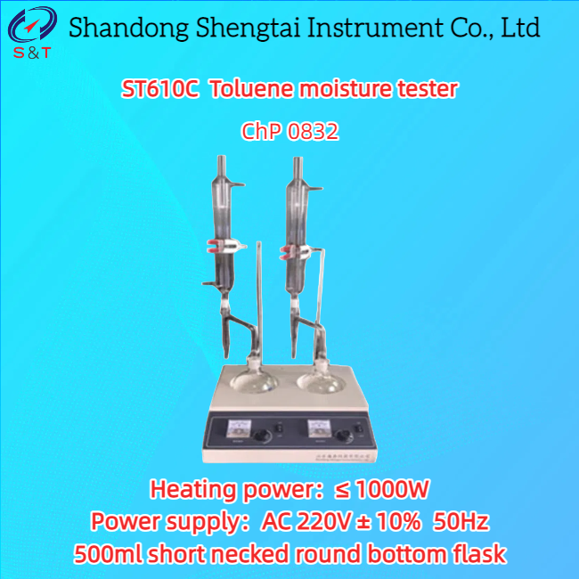 Η συσκευή μέτρησης υγρασίας με τη μέθοδο τολουολίου ST610C σχεδιάστηκε και κατασκευάστηκε σύμφωνα με τις τεχνικές απαιτήσεις και τους σχετικούς κανονισμούς της τέταρτης μεθόδου τολουολίου στην Φαρμακοποιία 2025, μέθοδος 0832 για τον προσδιορισμό της υγρασίας. Είναι κυρίως κατάλληλη για τον προσδιορισμό της υγρασίας κινέζικων φαρμακευτικών υλικών, παρασκευασμάτων και άλλων υλικών.