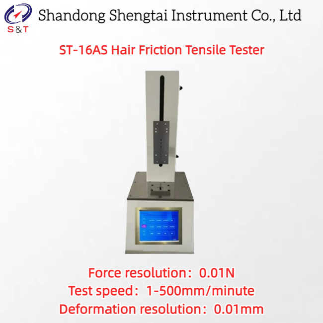 Ο δοκιμαστής τριβής μαλλιών ST-16AS μπορεί να χτενίσει και να μετρήσει τα μαλλιά οδηγώντας μια οδοντωτή χτένα με ρομποτικό χέρι για να κινηθεί,και χρησιμοποιείται για την αξιολόγηση των χαρακτηριστικών των μαλλιών, όπως η τριβή και η δύναμη τράβηξης