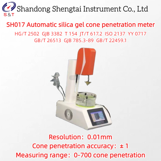 Ο αυτόματος μετρητής διείσδυσης κώνου σιλικόνης SH017 βασίζεται στο κινεζικό βιομηχανικό πρότυπο HG/T2502-1993 "5201 Silicone Grease" GJB3382-1998 "Προδιαγραφές για θερμική αγώγιμη γράσο σιλικόνης" και στο ψεύτικο στήθος MZ_ Σχεδιασμένο και κατασκευασμένο σύμφωνα με τις απαιτήσεις που καθορίζονται στο βιομηχανικό πρότυπο T 154-2020, είναι ένα ειδικό όργανο για τη δοκιμή της διείσδυσης κώνου του γράσου σιλικόνης.