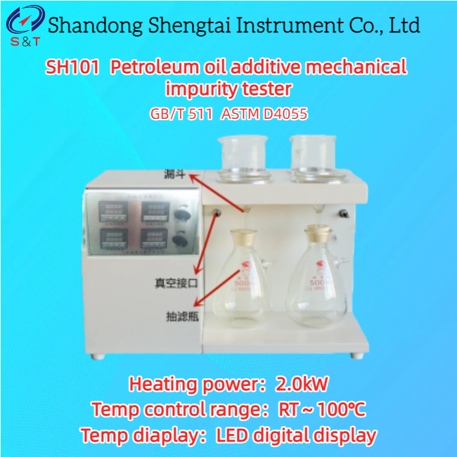 Ο δοκιμαστής μηχανικών προσμείξεων SH101 έχει σχεδιαστεί σύμφωνα με τις απαιτήσεις του εθνικού προτύπου GB/T 511 "Μέθοδος καθορισμού μηχανικών προσμείξεων προϊόντων πετρελαίου και πρόσθετων υλών (μέθοδος βάρους) "Είναι κατάλληλο για τον προσδιορισμό όλων των ειδών ελαφρών και βαρέων ελαίων, λιπαντικών ελαίων και πρόσθετων μηχανικών προσμείξεων στα προϊόντα πετρελαίου.