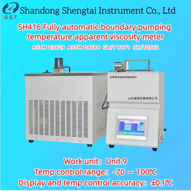 The SH416 fully automatic boundary pumping apparent viscosity meter is designed and manufactured in accordance with the requirements of the Chinese national standard GB/T 9171-1988 Engine Oil Boundary Pumping Temperature Determination Method, καθώς και SH/T0562, και πληροί επίσης το πρότυπο της πετροχημικής βιομηχανίας ASTM D3829 D4684; Ένα όργανο που χρησιμοποιείται για τον προσδιορισμό της οριακής θερμοκρασίας άντλησης, (χαμηλής θερμοκρασίας) τάσης απόδοσης,και φαινομενική ιξώδες του ελαίου κινητήρα αυτοκινήτου, με ευρύ εύρος ελέγχου θερμοκρασίας από -5 °C έως -40 °C. Η όλη πειραματική διαδικασία ελέγχεται αυτόματα από υπολογιστές.