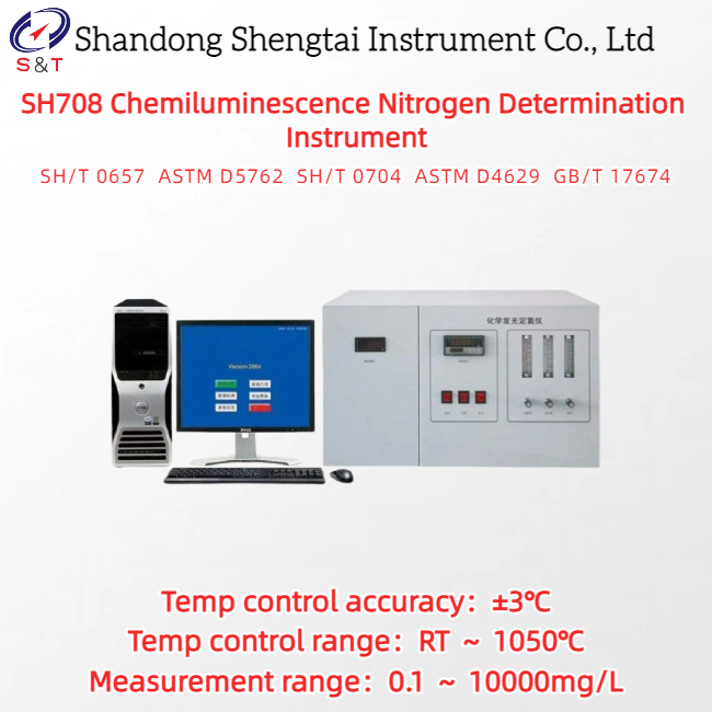 Ο αναλυτής αζώτου χημειοφωτισμού SH708 χρησιμοποιεί τη μέθοδο χημειοφωτισμού για τον προσδιορισμό της συνολικής περιεκτικότητας σε άζωτο,που βελτιώνει την ικανότητα αντίστασης στις παρεμβολές των προσμείξεων και αποφεύγει τη δύσκολη λειτουργία του κυψελού τιτλοποίησης που προκαλείται από την κουλομετρική μέθοδο και τους επακόλουθους ασταθείς παράγοντεςΤα βασικά στοιχεία του συστήματος χρησιμοποιούν εισαγόμενα εξαρτήματα, εξασφαλίζοντας την αξιόπιστη απόδοση ολόκληρης της μηχανής.Εφαρμόζεται στον προσδιορισμό της συνολικής περιεκτικότητας σε άζωτο στο πετρέλαιο παραφίνης, πετρέλαιο ντίζελ, βενζίνη, λιπαντικά έλαια, καύσιμο, υγροποιημένο αέριο και φυσικό αέριο, καθώς και άλλα πετρελαϊκά προϊόντα, χημικές πρώτες ύλες και τελικά προϊόντα,σύμφωνα με το πρότυπο SH/T 0657 Καθορισμός ίχνη αζώτου σε υγρά υδρογονάνθρακες πετρελαίου (μέθοδος οξειδωτικής καύσης και χημειοφωτισμού), ASTM D5762-2017, SH/T 0704, ASTM D4629, GB/T 17674 Καθορισμός της περιεκτικότητας σε άζωτο στο αργό πετρέλαιο με μέθοδο χημειοφωτισμού ένεσης πλοίου).