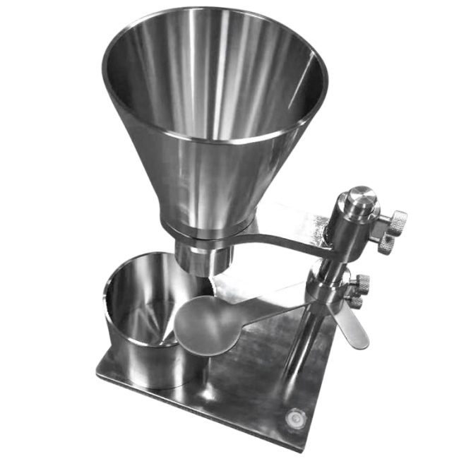 Μια ορισμένη ποσότητα δείγματος διέρχεται μέσω ενός κωνικού χωνιού και εισέρχεται σε έναν κυλινδρικό δοχείο γνωστού όγκου για να προσδιοριστεί η μάζα του δείγματος που απαιτείται για να γεμίσει το δοχείο.