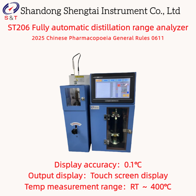 Ο πλήρως αυτόματος αναλυτής εύρους απόσταξης ST206 διαθέτει έγχρωμη οθόνη LCD, διάλογο ανθρώπου-μηχανής με κινεζικό μενού, καθοδηγούμενη λειτουργία και πλήρως αυτοματοποιημένη διαδικασία μέτρησης. Σχεδιασμένο σύμφωνα με τις απαιτήσεις του Γενικού Κανόνα 0611 της Κινεζικής Φαρμακοποιίας του 2025, Μέθοδος Προσδιορισμού Εύρους Απόσταξης, το εύρος απόσταξης αναφέρεται στο εύρος θερμοκρασίας ενός υγρού που αποστάζεται σύμφωνα με την ακόλουθη μέθοδο, βαθμονομημένο σε τυπική ατμοσφαιρική πίεση [101.3kPa (760mmHg)], από την έναρξη της απόσταξης της πέμπτης σταγόνας έως ότου αποσταχθούν μόνο 3-4ml ή μια ορισμένη αναλογία του όγκου του δείγματος δοκιμής.